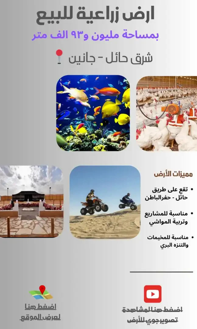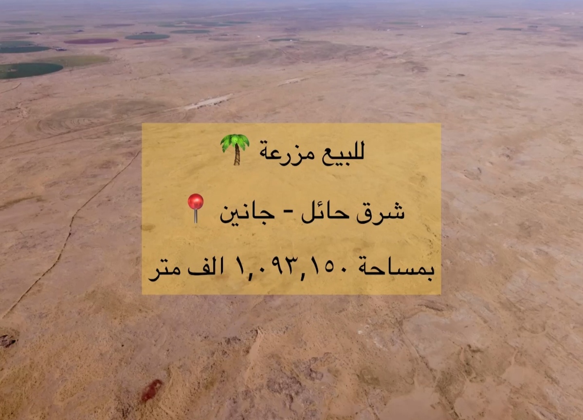 ارض زراعية للبيع شرق حائل - جانين تقع علي طريق حائل - حفر الباطن مناسبة للمشاريع وتربية المواشي مناسبة للمخيمات والتنزه البري سعر المتر 80 هلله