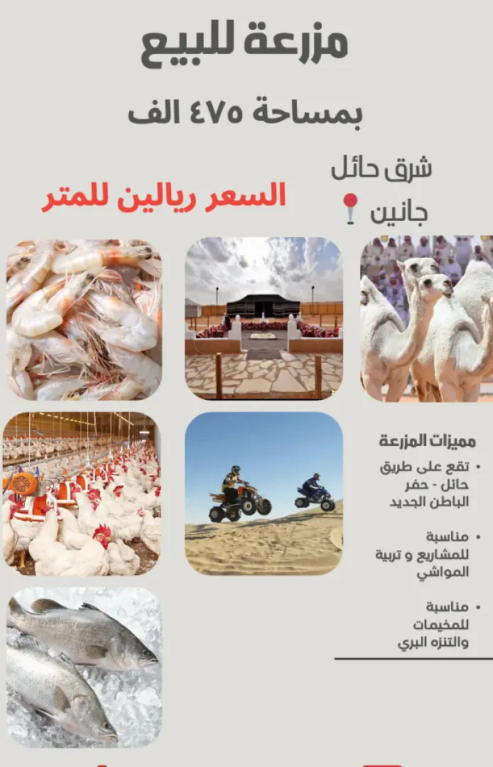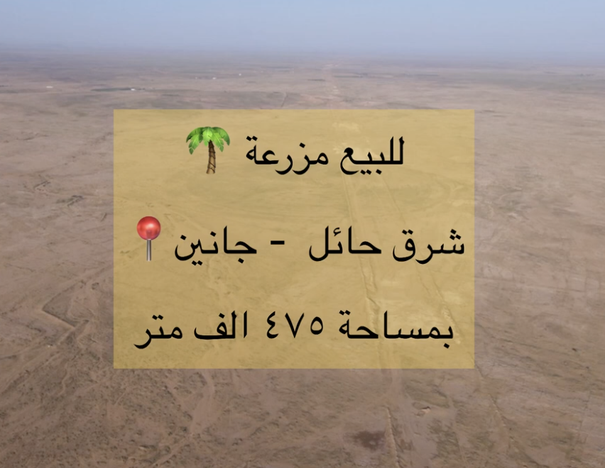 ارض زراعية للبيع شرق حائل - جانين المساحة 475 الف متر تقع علي طريق حائل - حفر الباطن الجديد مناسبة للمشاريع وتربية المواشي مناسبة للمخيمات والتنزه البري