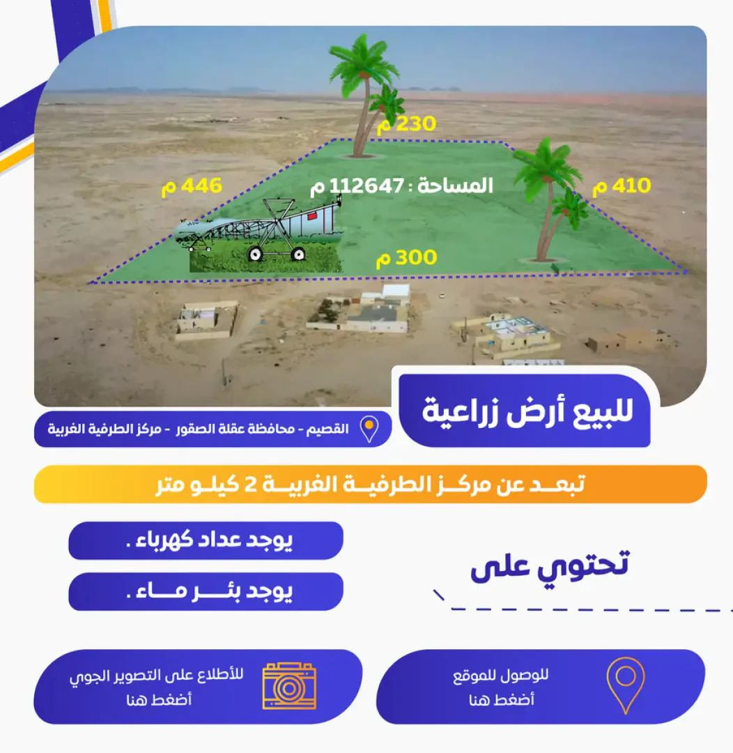 ارض زراعية للبيع في القصيم - محافظة عقلة الصقور - مركز الطريفة الغربي المساحة 112647 متر يوجد بئر يوجد عداد كهرباء تبعد عن مركز الطريفة الغربي 2 كيلومتر