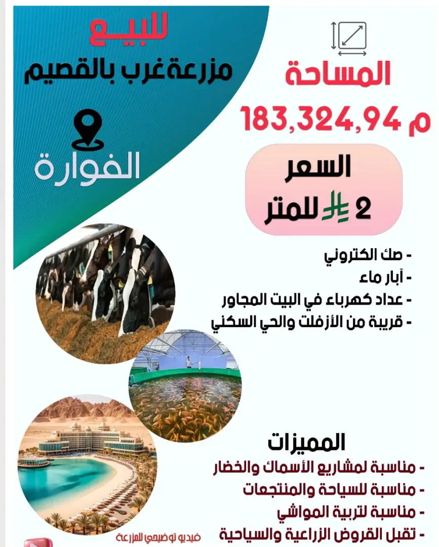 ارض زراعية للبيع غرب القصيم - محافظة الفوارة المساحة 183324 متر صك الكتروني ابار ماء عداد كهرباء في البيت المجاور قريبة من الازفلت والحي السكني مناسبة لمشاريع الاسماك والخضار مناسبة للسياحة والمنتجعات مناسبة لتربية المواشي تقبل القرض